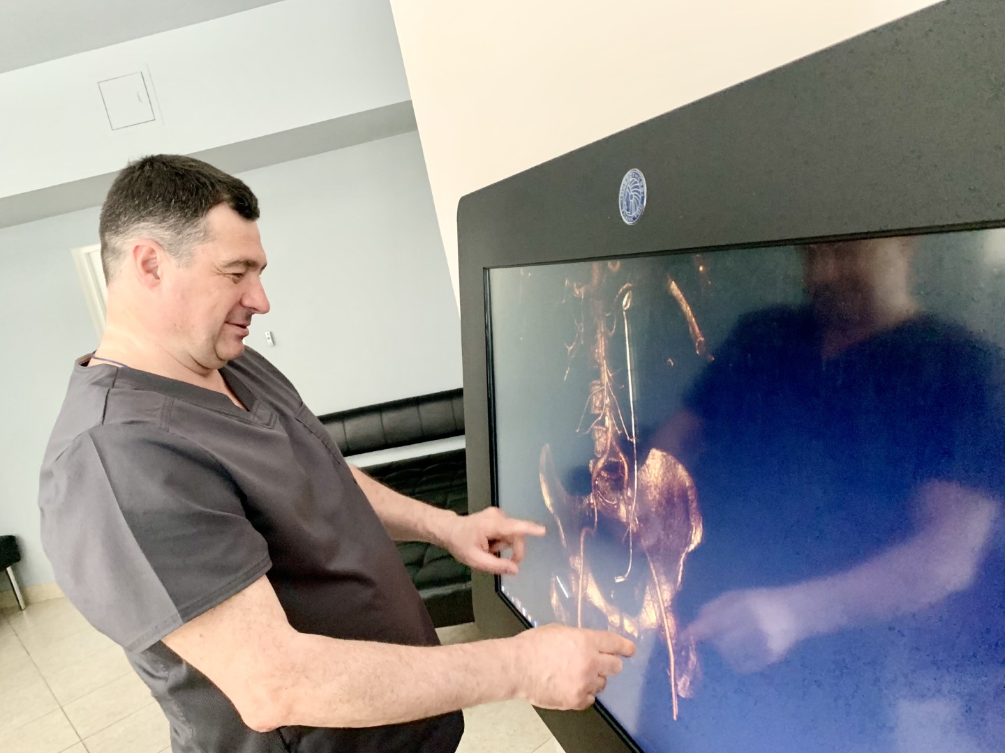 Кроме того, перед каждым операционным залом установлен мини-монитор, где можно увидеть весь ход операции, вывести на экран любые данные диагностики, КТ, МРТ или др., при необходимости связаться с оперирующей бригадой по видеосвязи, не заходя в нее.