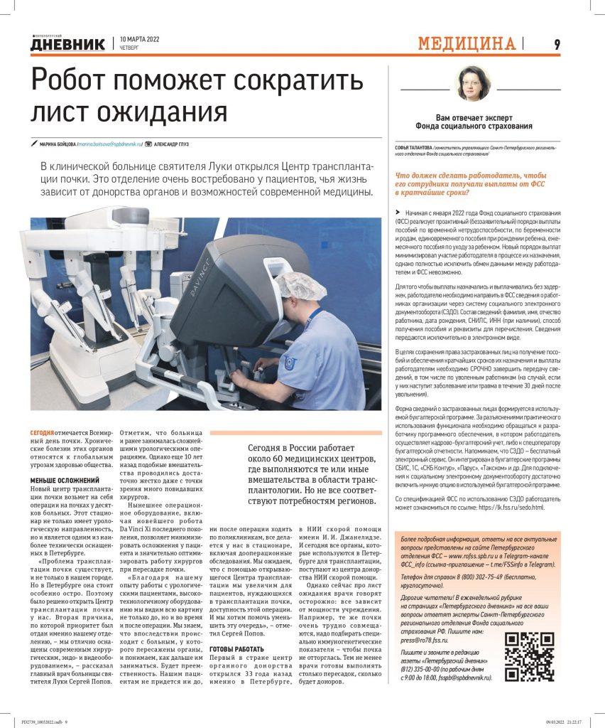 Петербургский Дневник к Международному дню почки об открытии направления трансплантации почки