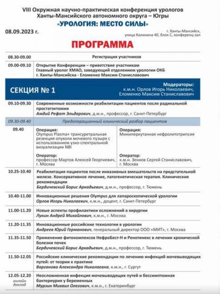 8 сентября 2023 года в работе Окружной научно-практической конференции урологов Ханты-Мансийского автономного округа - Югры «Урология: место силы» принял участие Орлов И.Н., заместитель главного врача по медицинской части, кандидат медицинских наук, хирург-уролог.