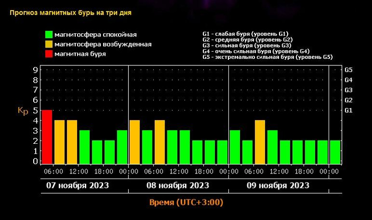 Весь вчерашний день и сегодня, 7 ноября, магнитосфера остается в возбужденном состоянии. После небольшого снижения активности вновь начинается рост, вплоть до уровня бури.