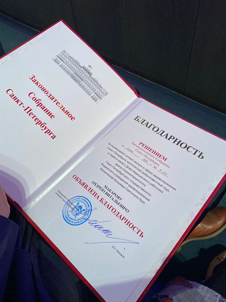 Ведущий оториноларинголог Клинической больницы Святителя Луки @lucaclinic.ru, пластический хирург Макаров А.В. @dr.andrei_makarov за выдающиеся личные заслуги в сфере здравоохранения, многолетний добросовестный труд отмечен Благодарностью  Законодательного Собрания Санкт-Петербурга.